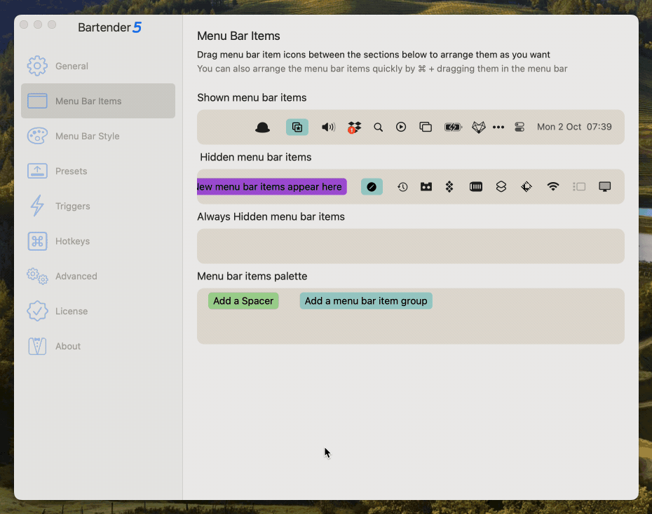 The process of creating these menu bar item groups can be executed seamlessly within Bartender Settings, specifically under the "Menu Bar Items" section, or within a Preset. The procedure remains consistent in both contexts: you simply drag the "Add a menu bar item group" lozenge from the Palette section to your preferred location within the menu bar.